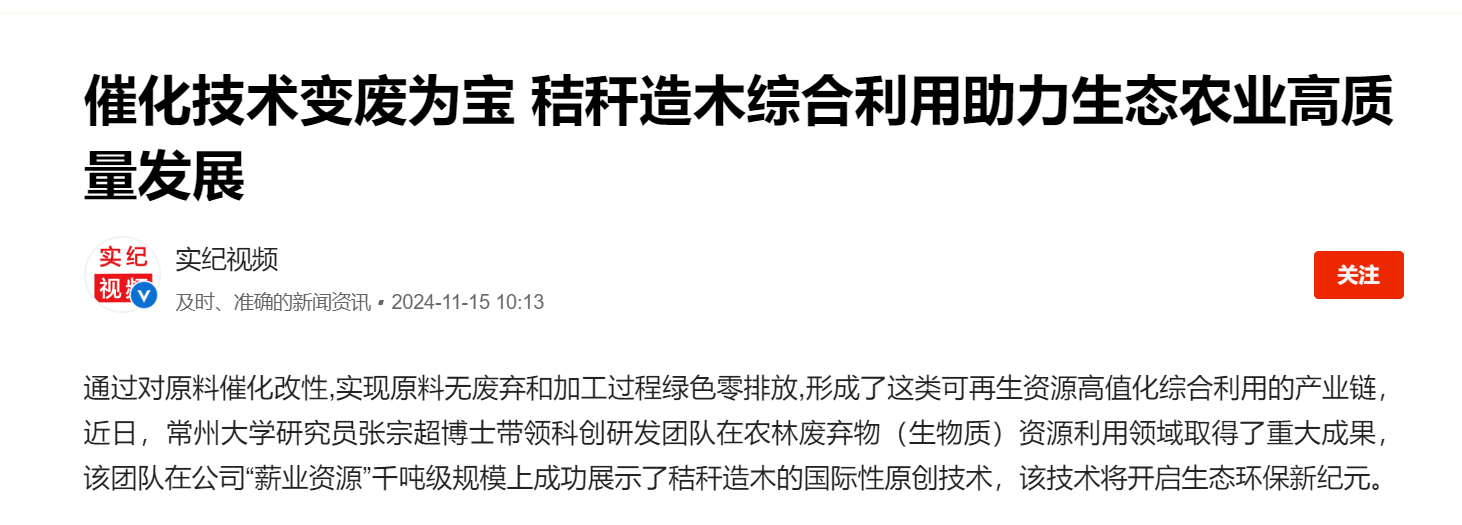 通过对原料催化改性,实现原料无废弃和加工过程绿色零排放,形成了这类可再生资源高值化综合利用的产业链,近日,常州大学研究员张宗超博士带领科创研发团队在农林废弃物(生物质)资源利用领域取得了重大成果,该团队在公司“薪业资源”千吨级规模上成功展示了秸秆造木的国际性原创技术,该技术将开启生态环保新纪元。